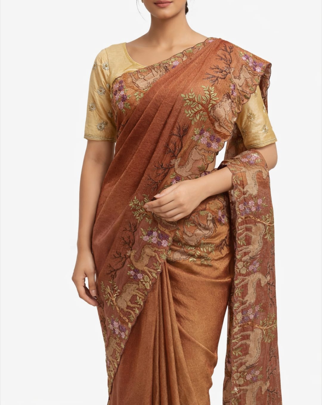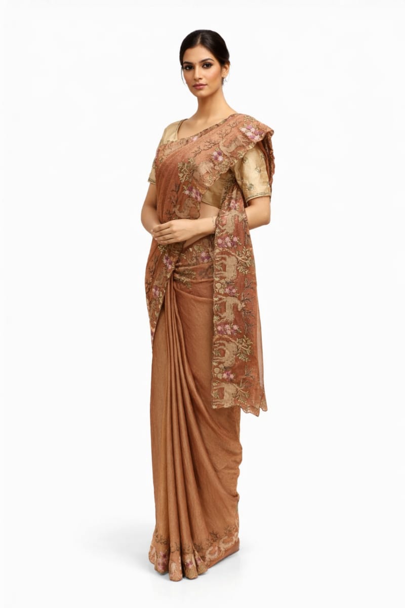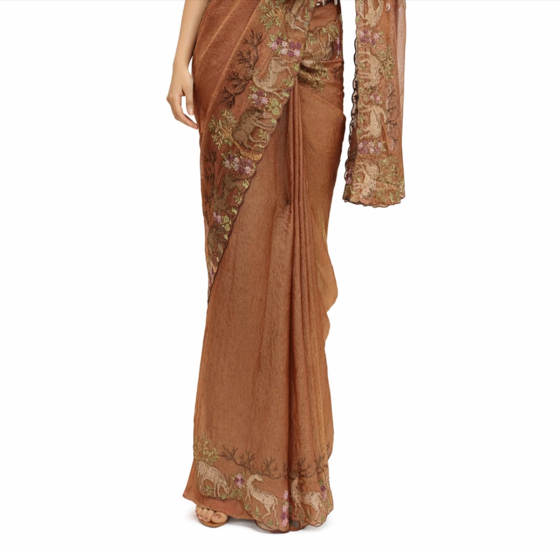 Artistic Deer Motif on Brown Embroidered Chiffon Saree