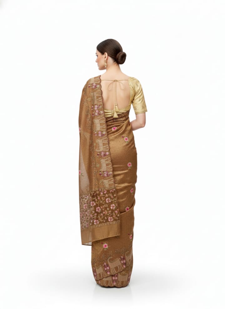Depth of Sophistication The classic brown color adds depth and sophistication. We recommend this saree for women who prefer understated yet impactful fashion. This versatile shade pairs beautifully with both traditional and contemporary accessories. Moreover, its lightweight texture makes it easy to carry for long hours. Ideal as a fancy party wear choice, it is perfect for weddings, receptions, and cultural events. Its elegant embroidery ensures a captivating appearance that leaves a lasting impression.